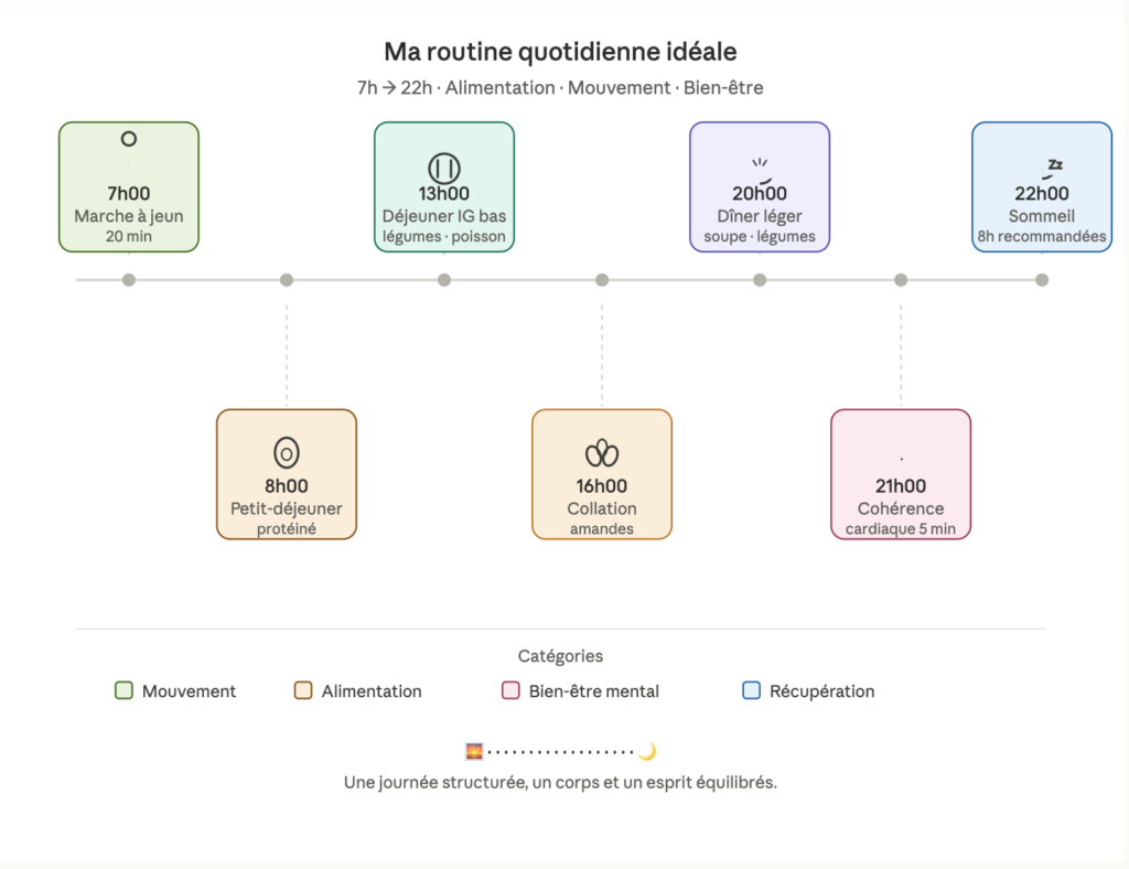- Les 5 piliers : alimentation anti-insulinique, activité physique régulière, sommeil de qualité, gestion du cortisol, réduction de l’alcool.