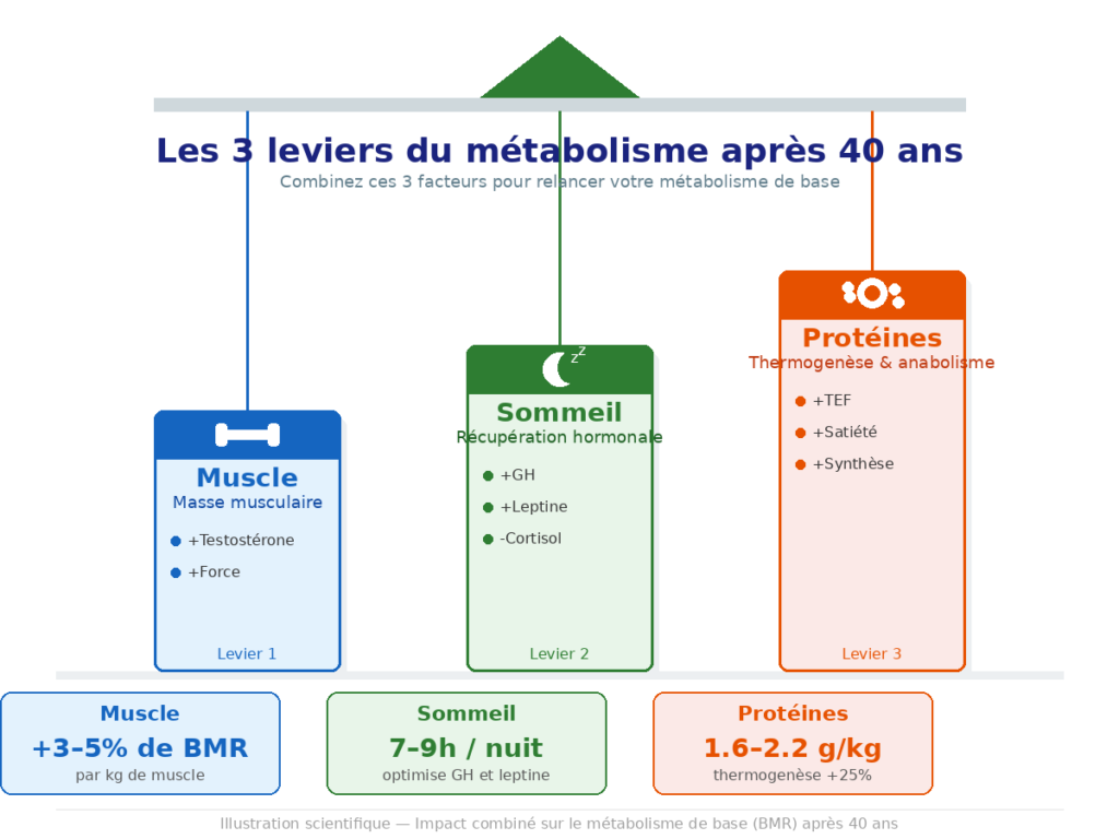 - Levier 1 : Reconstruire du muscle (chaque kg de muscle = +13 kcal/jour au repos)