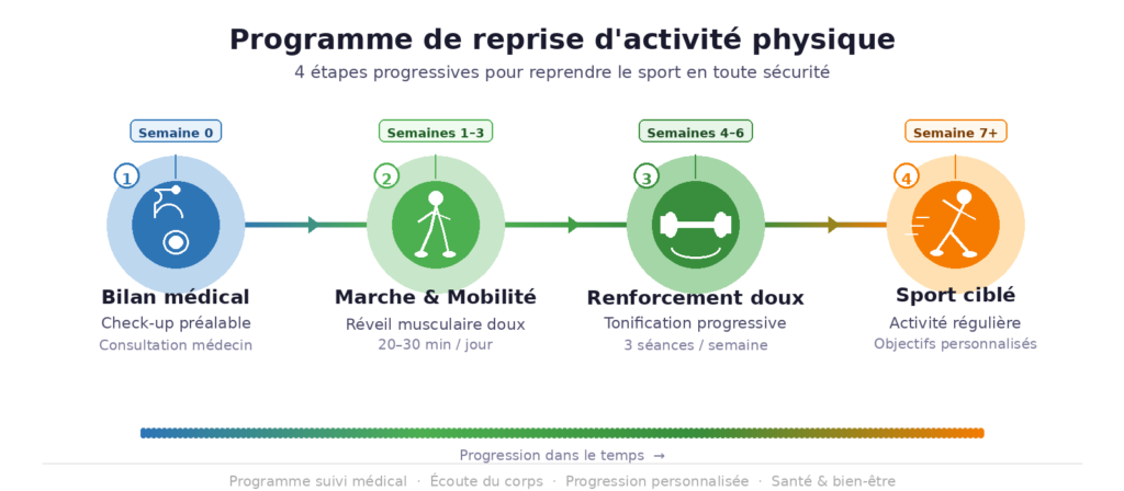 Bilan médical → marche → mobilité → renforcement doux → progression. Dans cet ordre. Pas de raccourci.