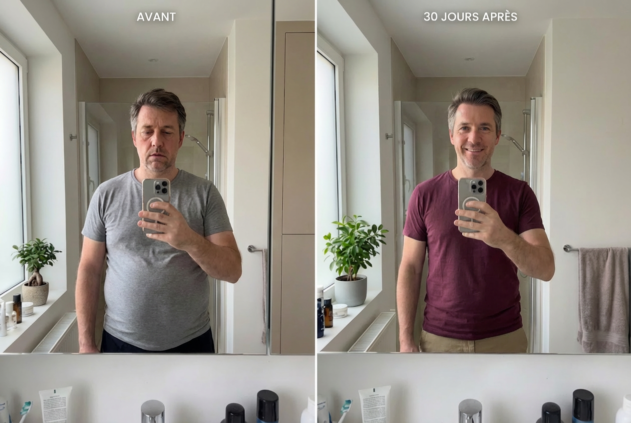 Tu te souviens de ce matin où tu as essayé d’enfiler ce jean que tu portais il y a trois ans ? Ce moment où tu as retenu ta respiration, en vain. Pas besoin de te juger — la quarantaine, c’est souvent ça : un ventre qui pousse en silence, entre deux réunions stressantes, un apéro entre amis et quelques nuits trop courtes.