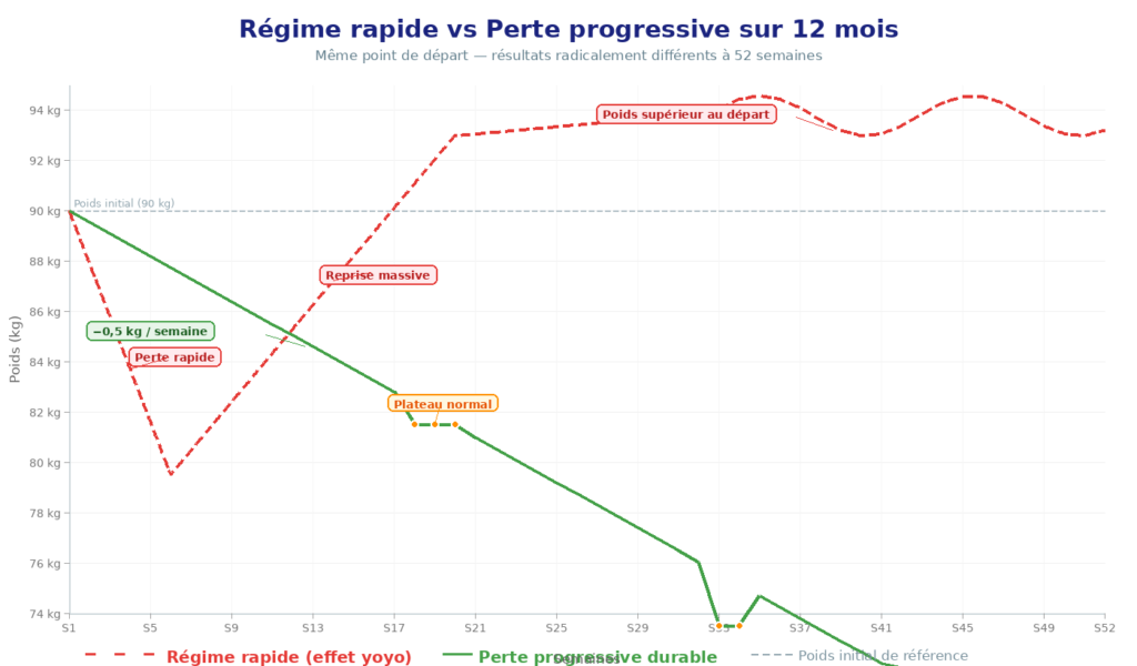 La perte rapide est donc principalement de l’eau et du muscle — pas de la graisse viscérale. Et c’est précisément ce qui prépare l’effet yoyo.